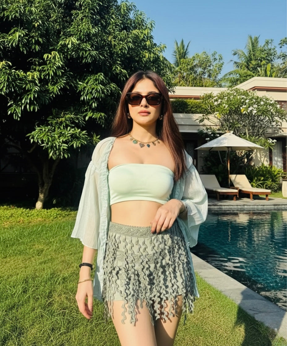 Look chic and relaxed in our Luna Top with Contrasting Shorts Set. The comfortable cotton polyester material is perfect for sunny days, making it great for outings and brunch. The mint greenish color adds a touch of fun to this co-ords set. Get ready to stand out and have a good time!